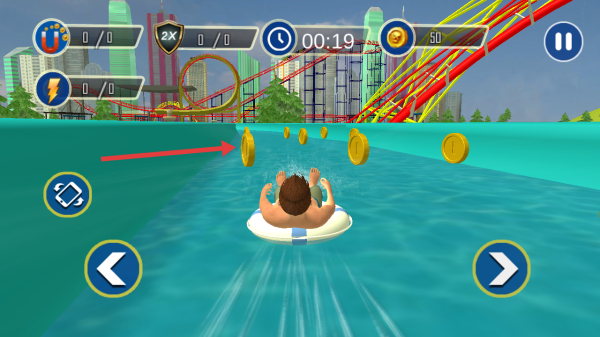 2、操控角色乘浮圈下滑,用左右按键调整方向,在滑道收集金币,注意避开障碍,利用道具界面左上角标识增益。