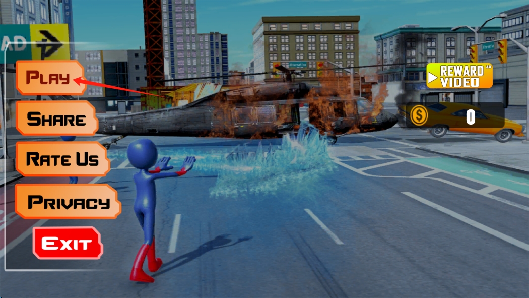 1、点击Play,开启动作冒险之旅,在城市中展开刺激战斗,根据需求选择分享、评分等功能。