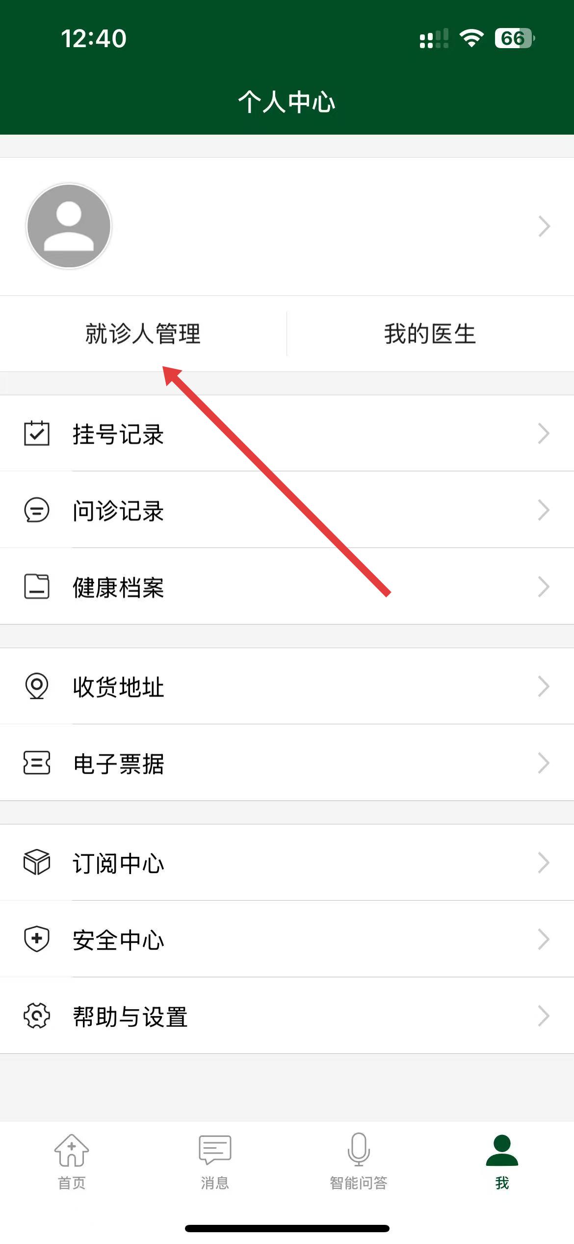3、在就诊人管理页面,点击添加就诊人按钮。