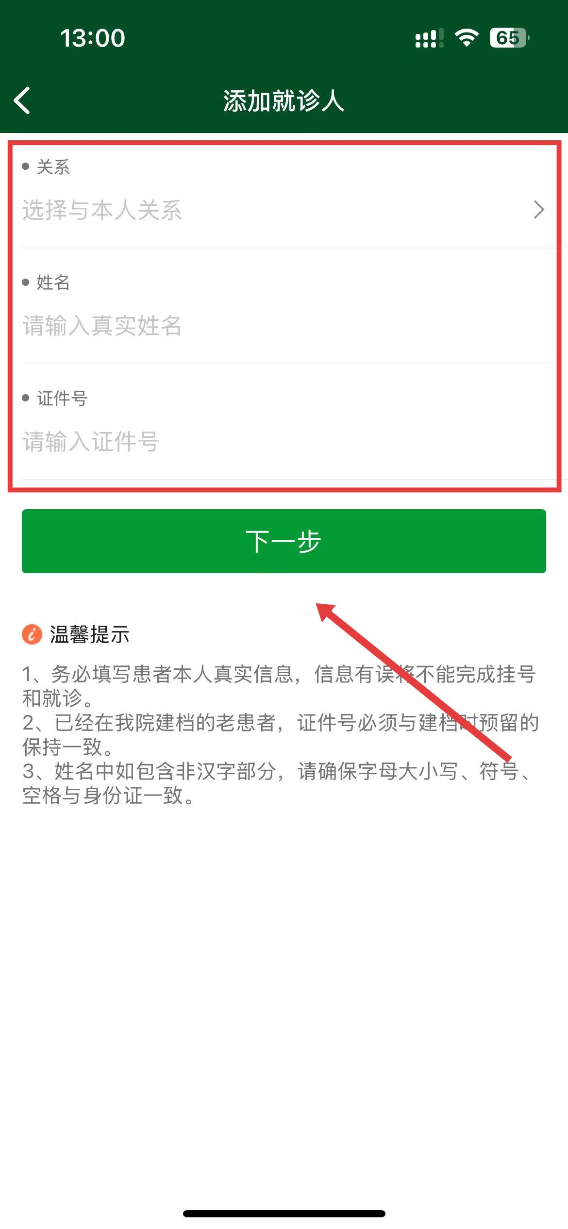 4、在添加就诊人页面,依次填写与就诊人的关系、就诊人真实姓名、证件号,确认信息无误后点击下一步完成添加。