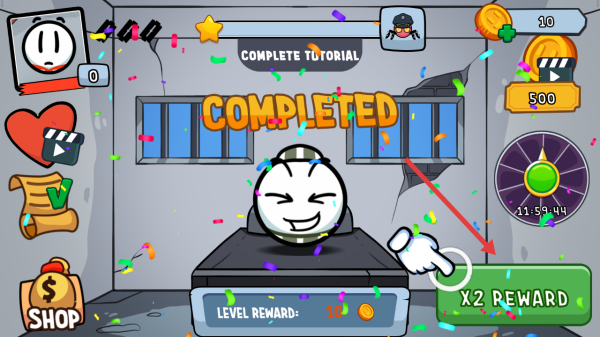 3、完成关卡触发COMPLETED结算,可领取奖励或看广告双倍获取,积累资源解锁新角色、关卡,持续冒险。