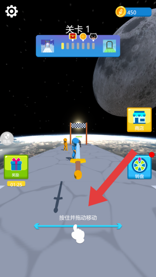 1、目前呈现关卡开始前的场景,有商店、转盘的功能,可根据文字提示:按住并拖动移动进行操作。