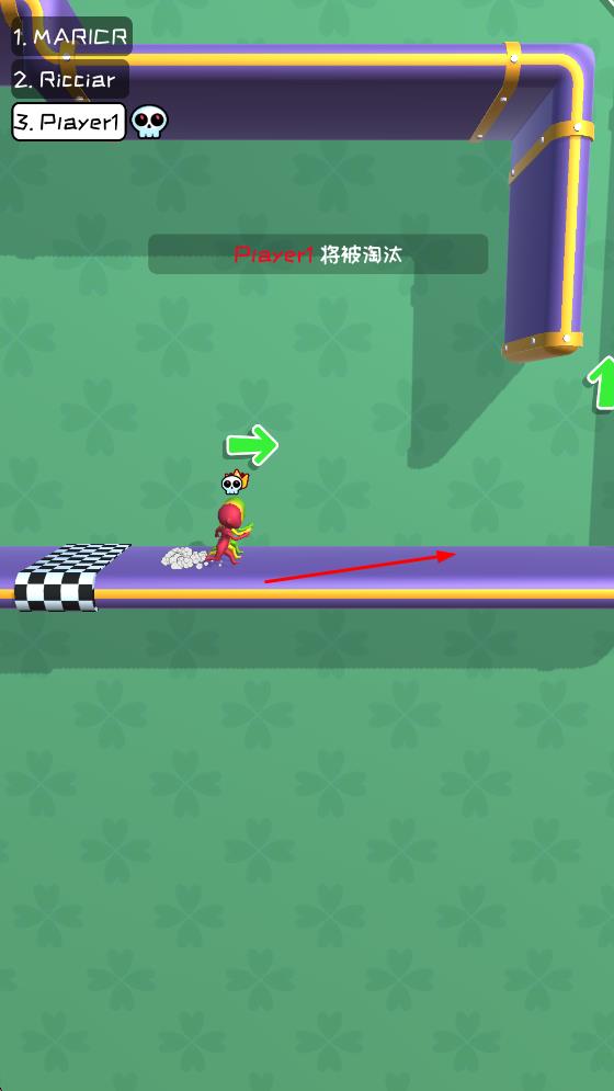 1、操控角色在紫色赛道上移动,留意上方排名与淘汰提示,为冲刺终点做好准备。