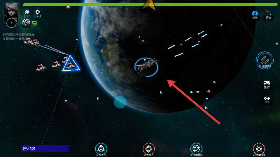 1、单指滑动控制舰队移动,自动锁定最近目标进行攻击。