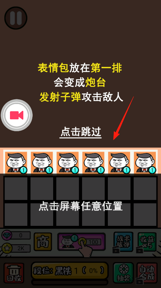 2、进入游戏,先看提示说表情包放第一排变炮台打敌人,别管提示,点点击跳过直接开始,或者按说明,把表情包拖到第一排,让它们变成炮台,发射子弹揍敌人。