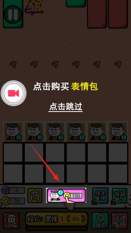 3、游戏里弹出点击购买表情包,想变强就点下方带星星的按钮买表情包,攒更多表情包去合成布置,让炮台更猛,不想买就点点击跳过,接着用现有表情包战斗,看怎么赢。