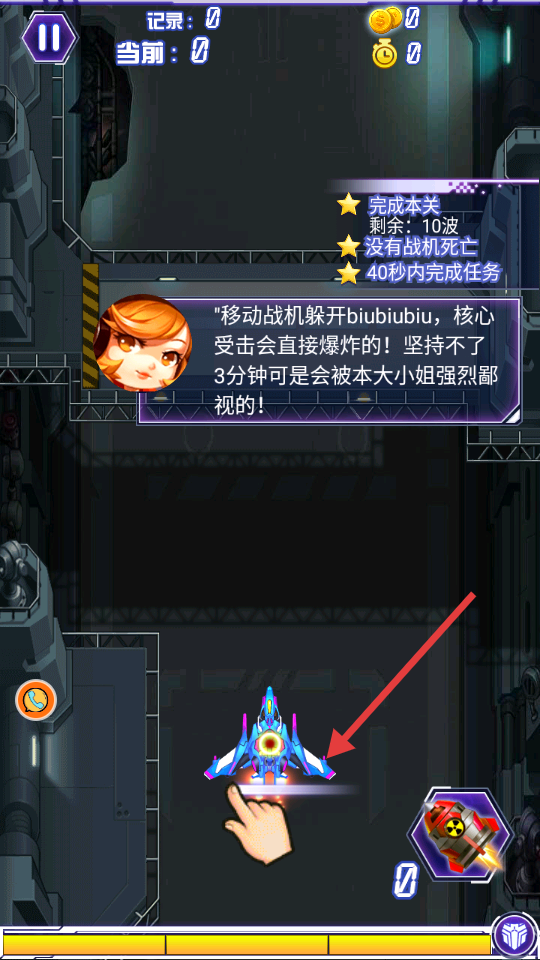 1、滑动屏幕控制战机移动,精准躲避敌方弹幕攻击。