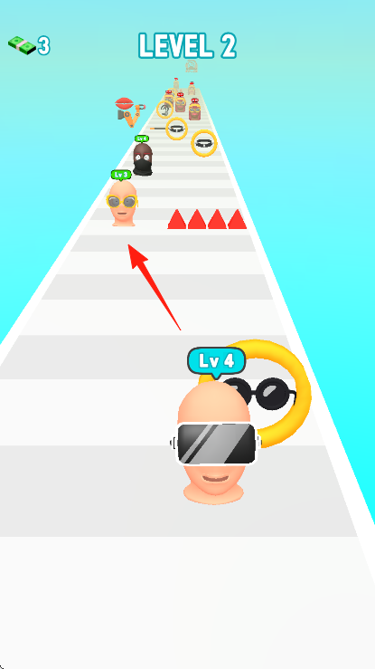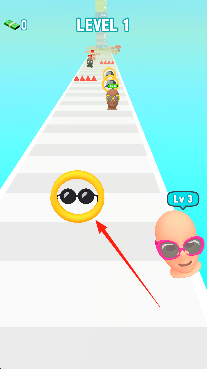 1、在Level1,操控角色头部,收集路上黄色圆环里的道具如眼镜,避开红色障碍,超越其他头戴角色。