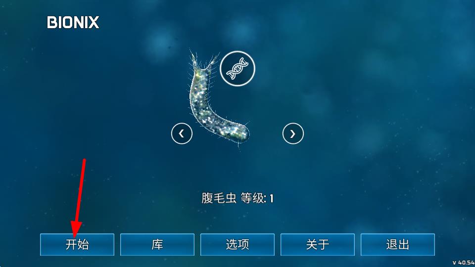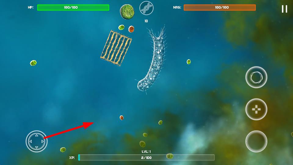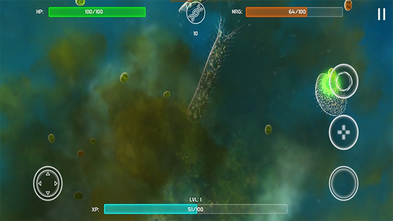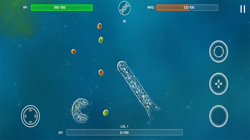 1、进入游戏后,以初始孢子形态在水域中活动,通过滑动屏幕控制移动方向,靠近小型浮游生物进行捕食,积累能量值。