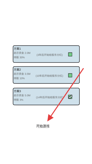 2、进入游戏后,选择合适的投资方案,如方案3等,点击开始游戏按钮,开始地产经营,学习地产投资和经营的基本步骤和技巧,完成任务目标。