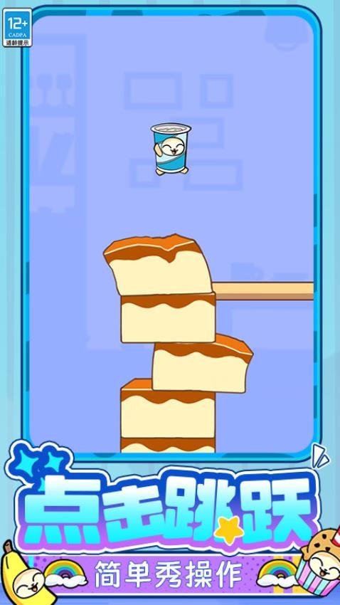 1、控制角色瞄准下一块食物平台,看准时机轻轻跳跃,保持落点在中心区域才能稳住,避免滑落失败。