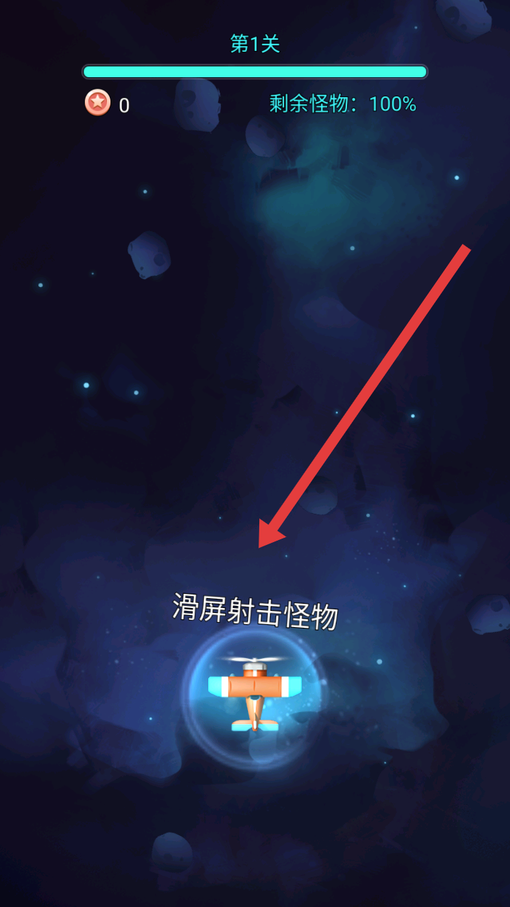 1、进入游戏后的第1关开局,需要跟随提示进行滑屏操控飞机,向怪物发起射击,熟悉攻击操作。