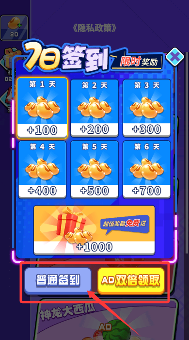 1、打开游戏后,前往每日福利区,可选择常规签到或观看广告领取双倍奖励。