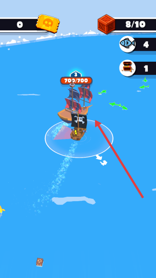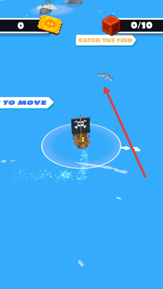 1、进入游戏,操控海盗船按CATCH THE FISH指引,移动捕捞鱼类,积累资源,完成木箱收集任务。