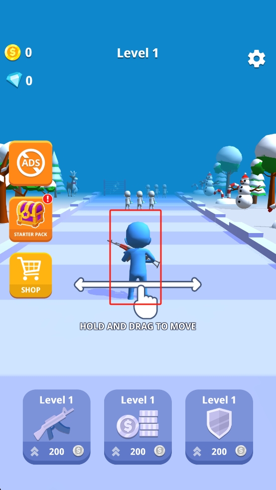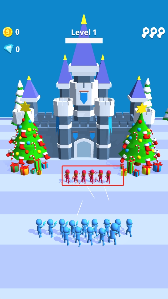 1、长按并拖动蓝色小人,控制其移动路径,沿途吸引白色小人加入队伍,壮大蓝色军团规模。