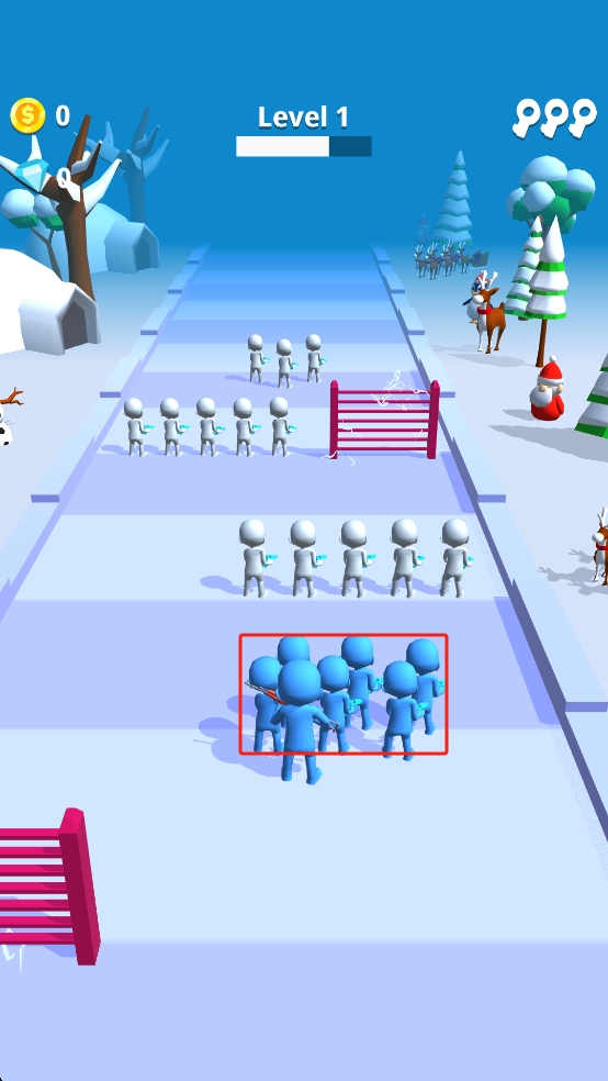 2、带领蓝色队伍前行,突破红色栅栏障碍,持续吸纳更多成员,提升队伍战斗力,应对后续的挑战。