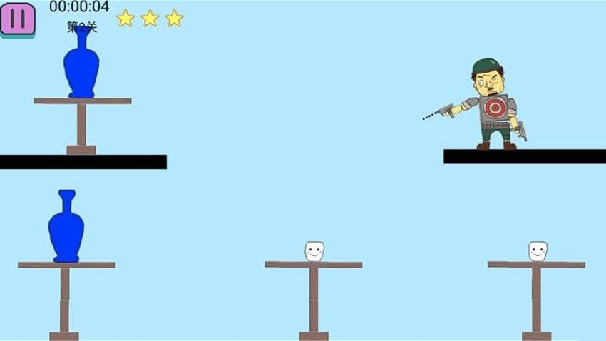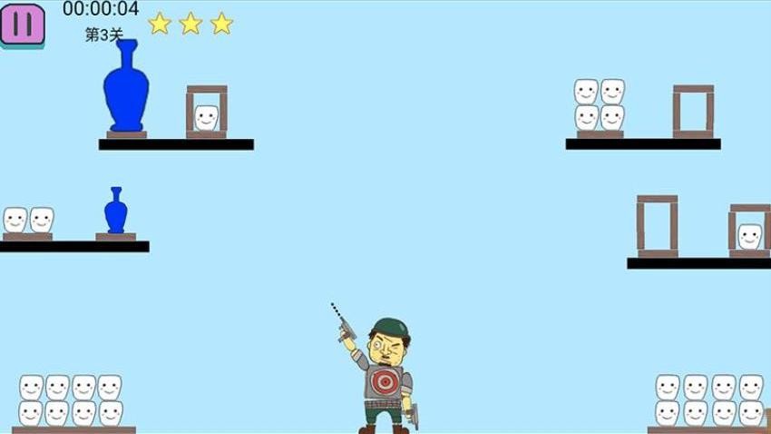 1、进入关卡后先观察场景布局,找出所有白色方块头和蓝色花瓶的位置,规划射击顺序,避免遗漏目标。