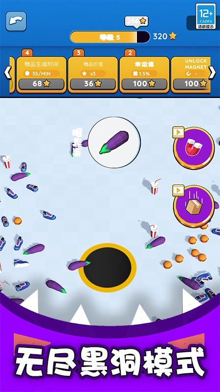 1、基础操作仅需单指滑动控制黑洞移动,触屏操作简单直观。黑洞会自动吸附范围内的物体,玩家只需专注移动路线规划。