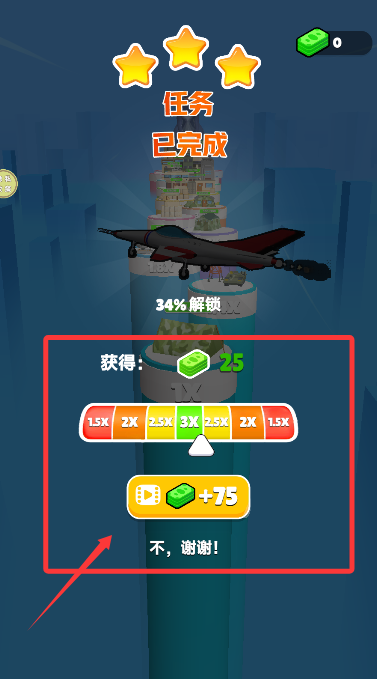 4、达成任务目标后,进入奖励结算界面,可选择奖励加成或继续闯关。