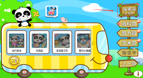 1、点击红框熊猫提示框,查看3-6岁探索站内容。