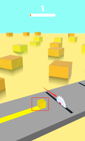 2、控制红框黄色立方体,避开旋转锯片障碍物。