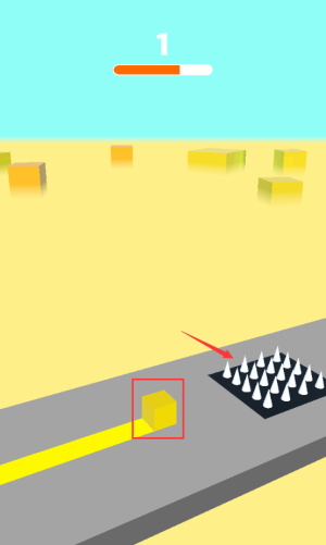3、引导红框黄色立方体,避开黑色尖刺危险区域。