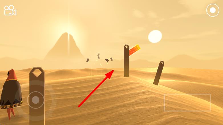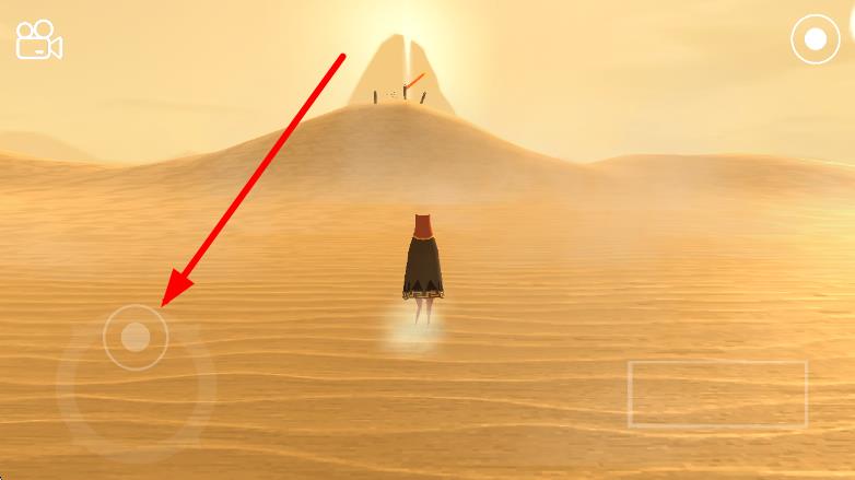 2、滑动左侧虚拟摇杆,控制角色移动方向,朝着箭头指向的山峰,在沙漠中探索前进。