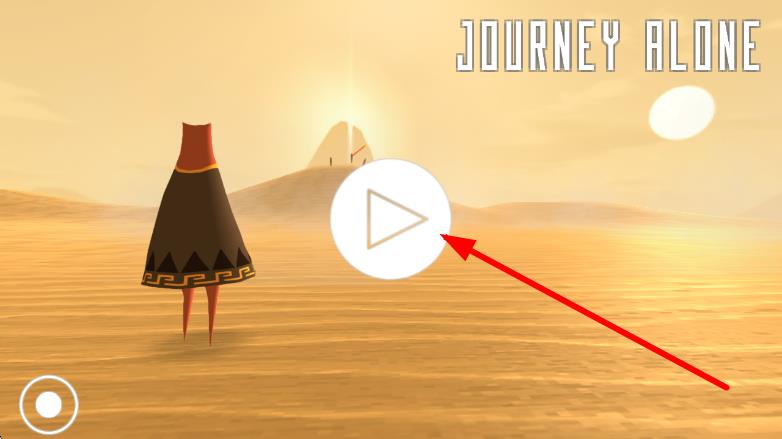 1、在初始界面,点击白色圆形播放的按钮,开启沙漠孤独之旅,操控角色向远处山峰前行。