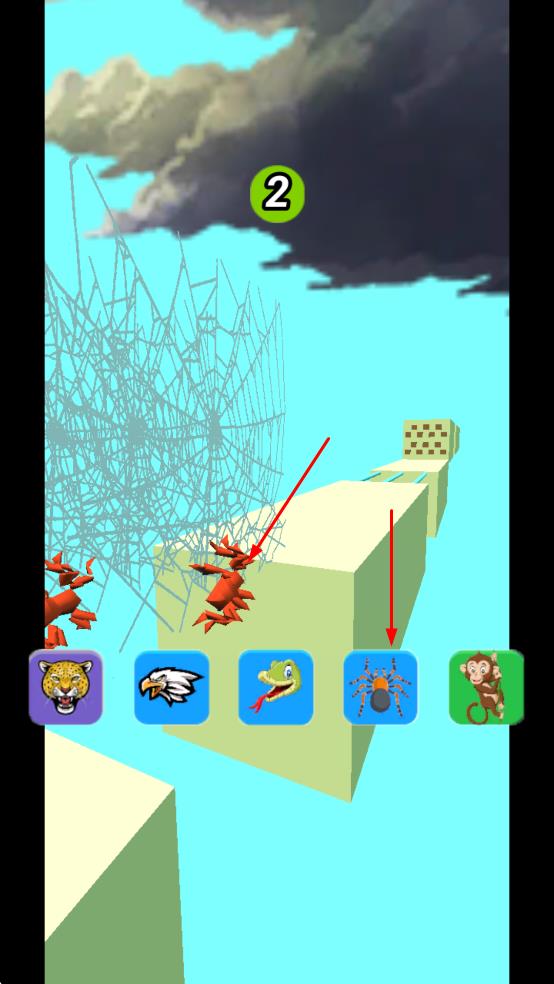 3、完成当前关卡后将进入下一关,根据新场景的障碍类型如蛛网障碍,选择合适的动物蜘蛛进行变身,继续依靠动物能力通关,沉浸式体验不同动物能力带来的趣味挑战。