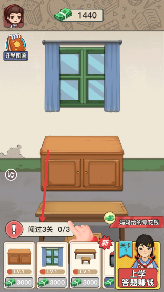 1、在游戏中,通过完成闯过3关等任务目标,获取零花钱奖励,用于升级家具等物品,提升游戏体验。