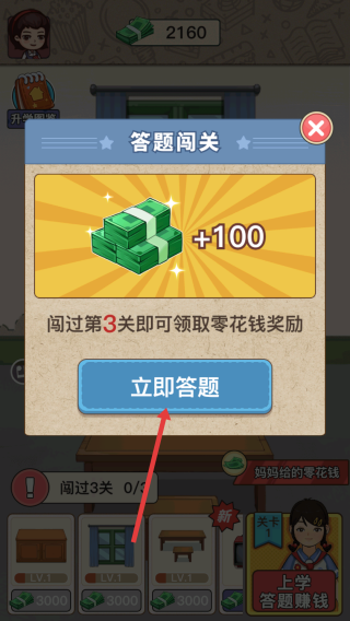 2、在游戏过程中,点击立即答题按钮,进入答题闯关环节,通过回答各种问题,获取分数和奖励,推进游戏进度。