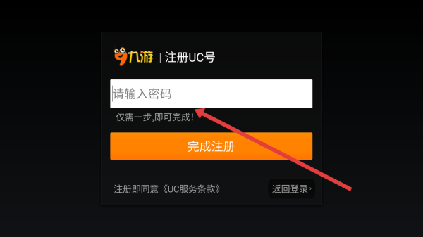 2、在九游注册UC号界面,于密码输入框填写密码,准备点击完成注册按钮,推进账号注册进程。