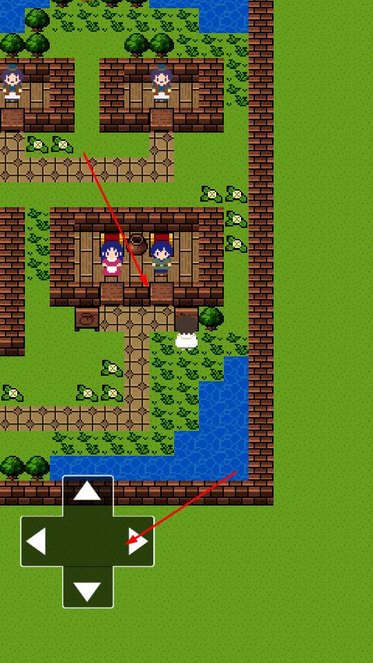 2、通过下方十字方向键操控角色移动,在村庄场景其中含房屋、水域、植被穿梭,触发NPC互动或场景事件。