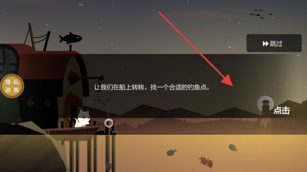 2、游戏提示让我们在船上转转,找一个合适的钓鱼点,点击屏幕进行操作,寻找最佳钓鱼位置。