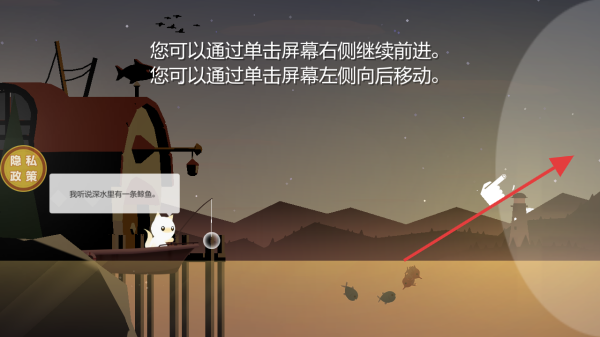 3、根据提示,您可以通过单击屏幕右侧继续前进,单击屏幕左侧向后移动,以此来调整位置寻找鱼群。