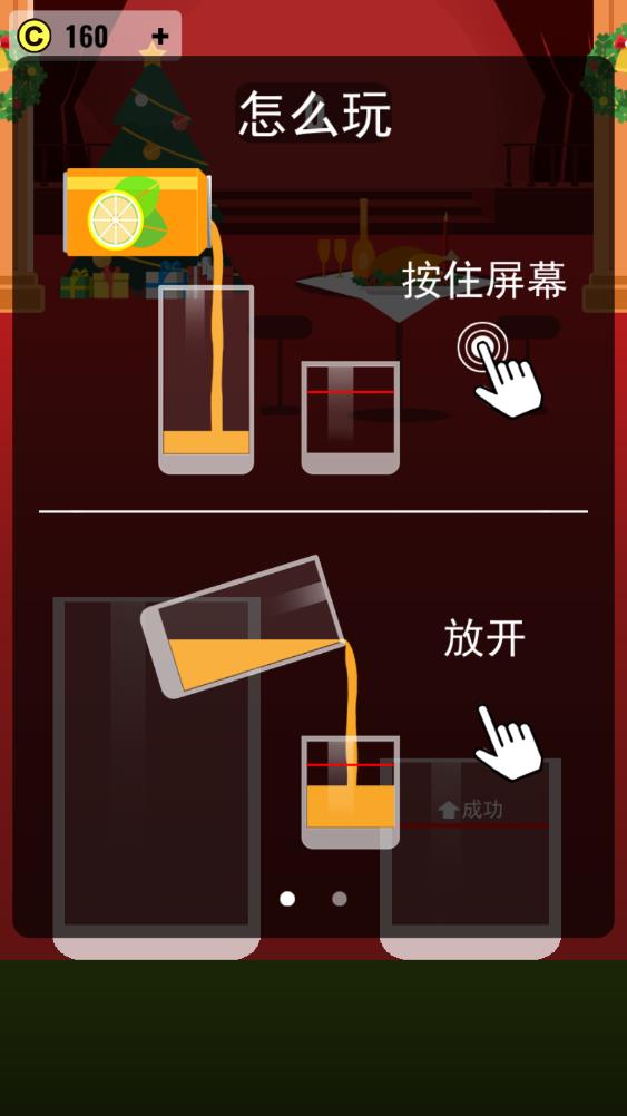 2、随着关卡推进,杯子容量与饮料流速变化,需精准控制按住时长,确保右边杯子接满适量饮料且不溢出。
