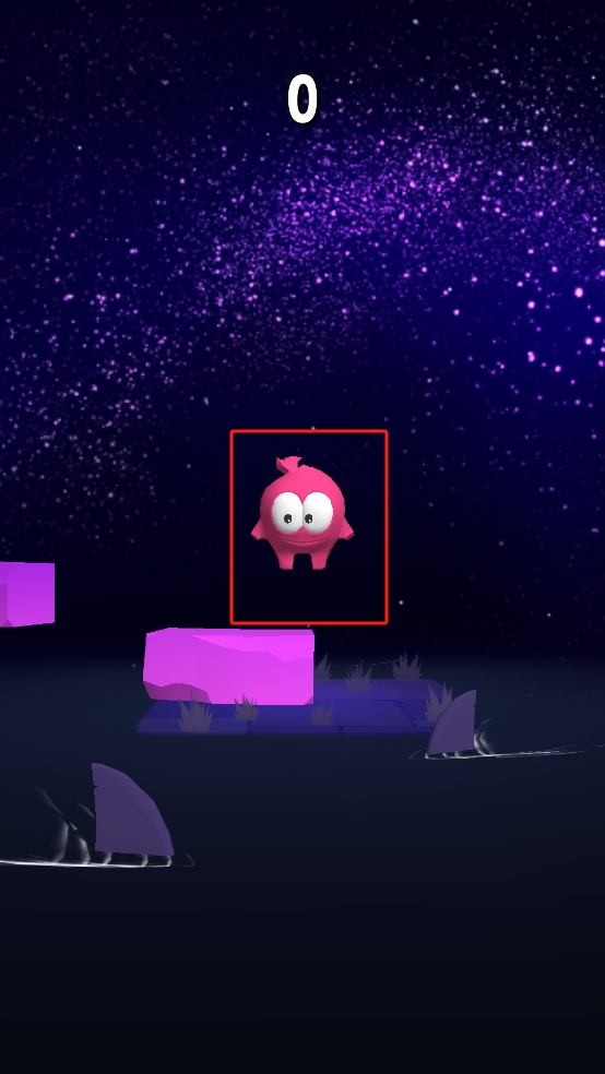 1、操控红框内粉色角色,在星空背景下,看准紫色平台位置,点击屏幕让角色跳跃,落在平台上。
