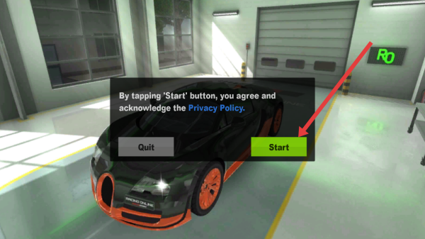 1、点击车库中提示框的绿色Start按钮,确认隐私政策后进入车辆选择界面,开启赛车游戏流程。