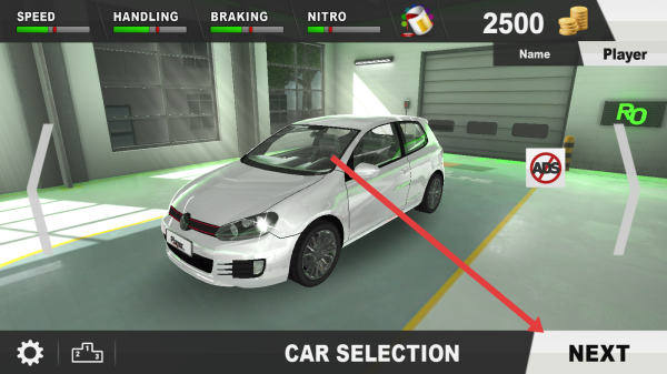 2、在车辆选择界面选定白色汽车,点击右下角Next按钮,进入驾驶场景,准备开始竞速。