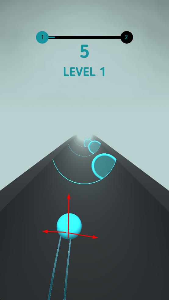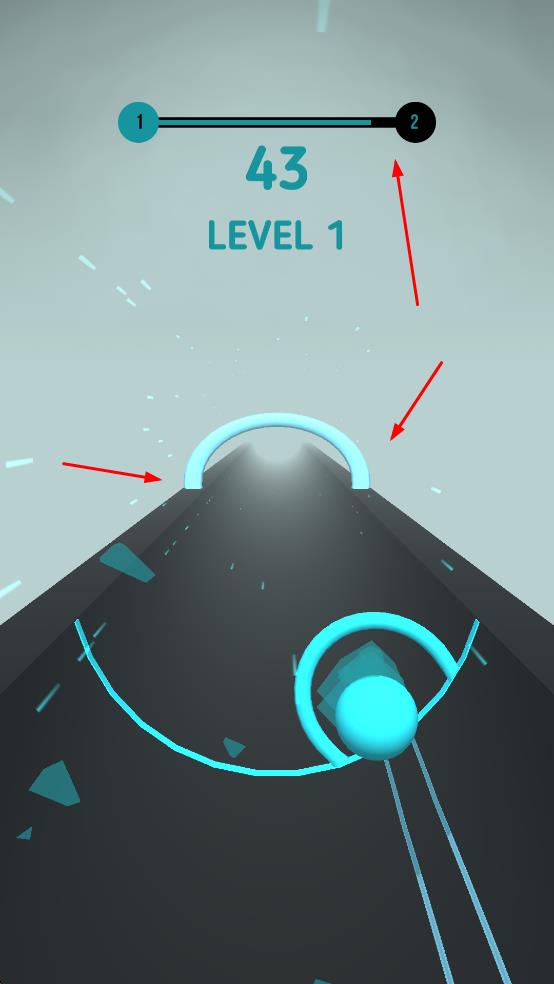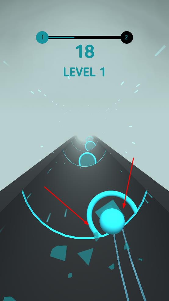 2、引导球体穿过蓝色环形区域,触发得分机制积累分数,同时注意躲避破碎障碍物,保障球体安全。