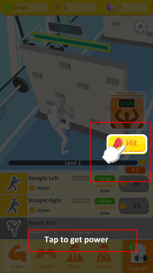 1、进入Level 1训练界面,点击右侧黄色Hit按钮,操控角色击打训练器,底部Tap to get power提示下,持续点击积累能量,获取金币界面上方金币数值动态变化。