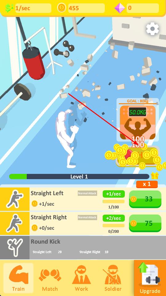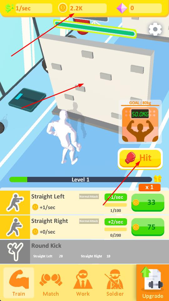 2、消耗金币升级Straight Left如提升至+1/sec、Straight Right等技能,增强每秒收益与击打效果;观察角色动作变化,解锁更多攻击方式训练。