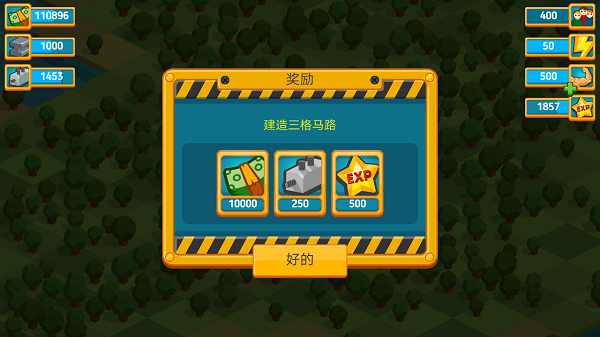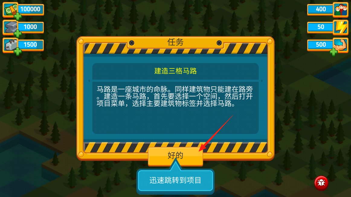1、看到任务提示建造三格马路,点好的确认,得先记住马路建造规则,建筑物要建在路旁,接下来去选空地,准备建马路。