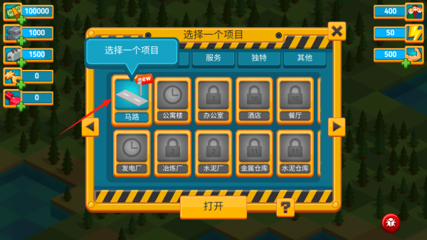 3、打开项目菜单,看到各种建筑项目,选马路,确定选马路后,点打开,就能在之前选的空地上建马路啦,慢慢把城市路网搭起来。