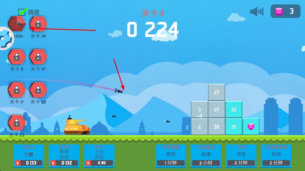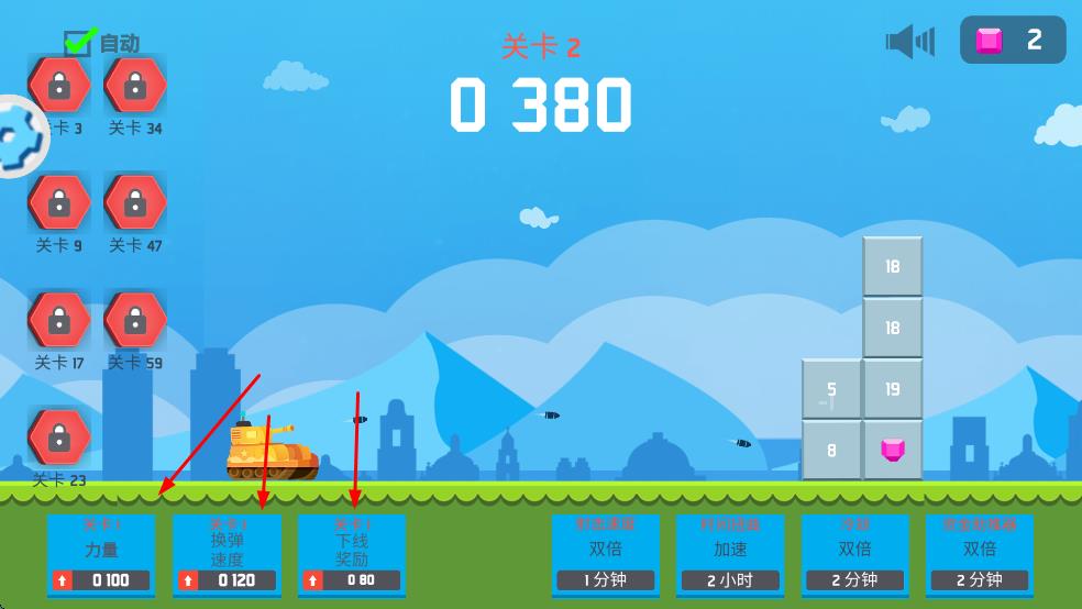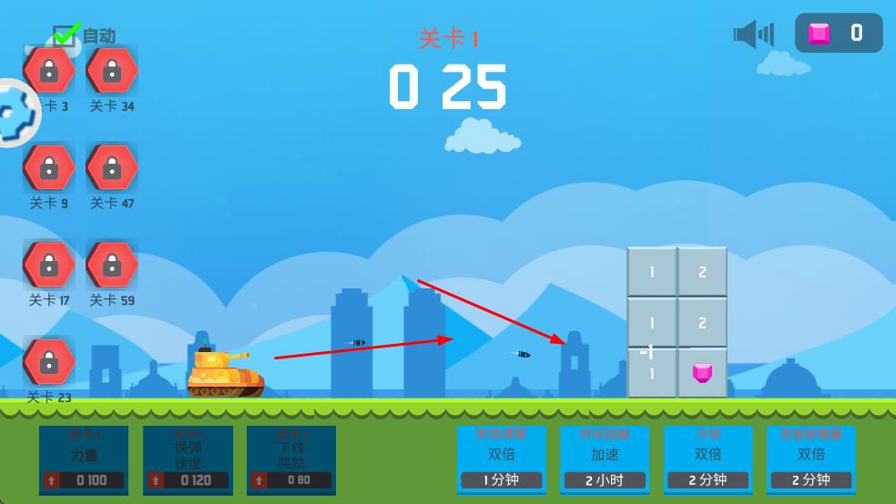 2、消耗道具升级坦克属性,如提升发射力量、加快换弹速度等,增强坦克作战能力,应对更高难度挑战。