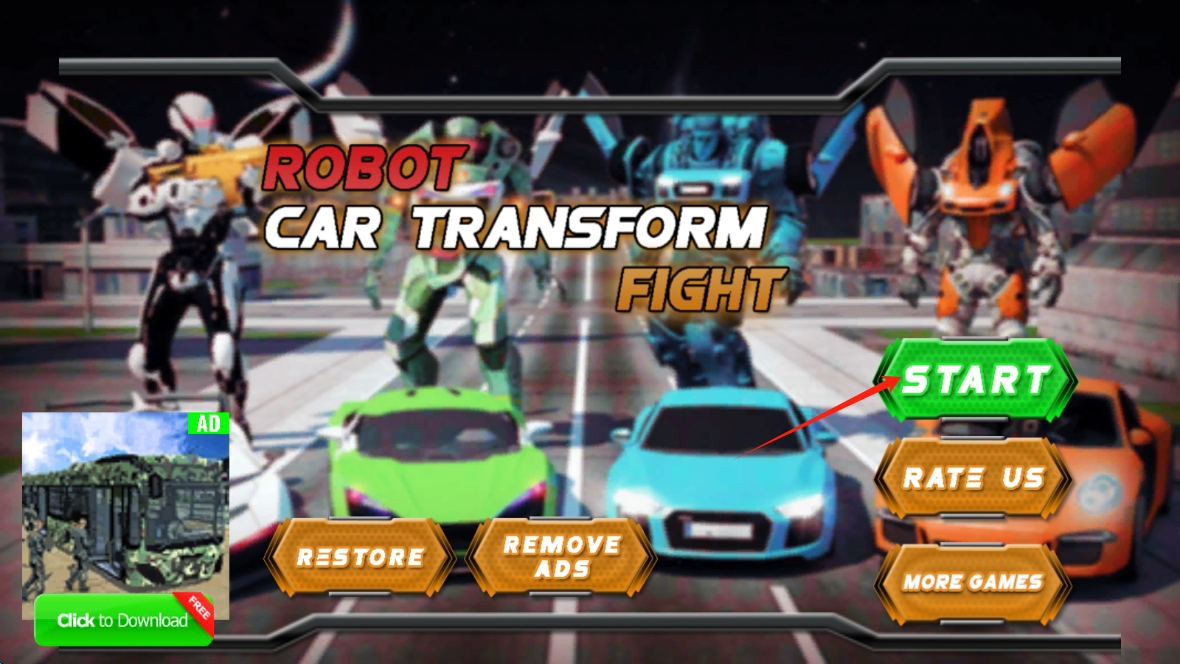 1、在Robot-Car-Transform-Fight界面,点击START,开启机器人汽车变形战斗冒险。
