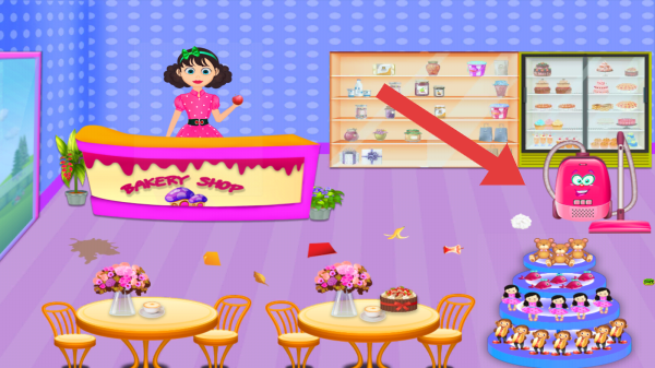 1、画面呈现了蛋糕店的场景,目前处于比较脏乱的一个状态,可根据指引点击吸尘器进行清理地面上的垃圾。