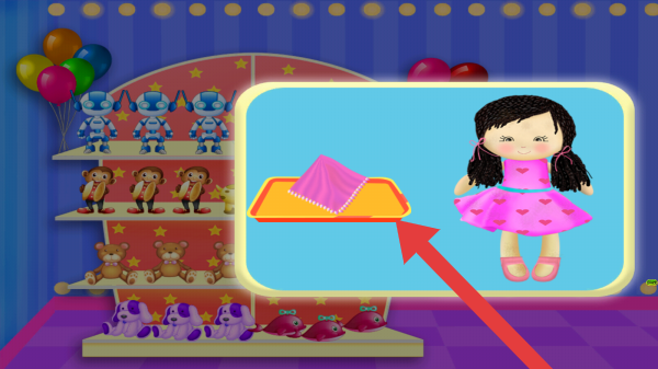 3、随机点击一个娃娃,可根据提示点击抹布进行擦拭布娃娃身上的灰尘,以此类推,需要将置物架的玩偶清理干净。