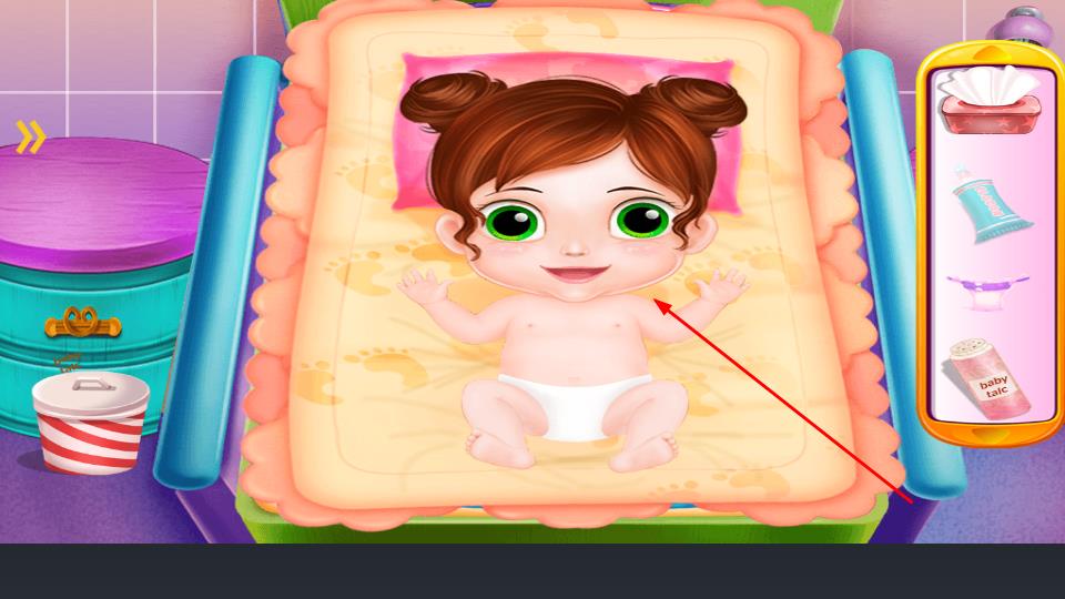 3、切换至护理台场景,宝宝躺卧,从右侧道具栏选择纸巾、乳液等物品,进行肌肤护理与装扮,提升宝宝状态。