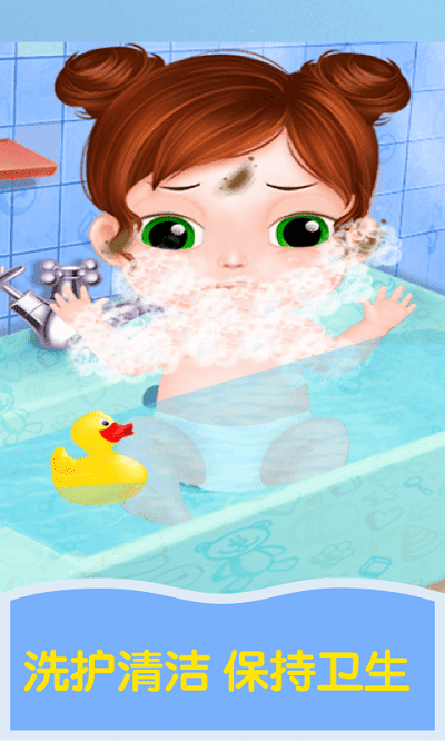 2、在浴室场景,帮助宝宝洗澡,清理身上泡沫,处理地面水渍,同时去给宝宝完成清洁护理。